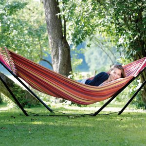 The Tonga Vulcano hammock which is the hammock that comes with the beach set is perfect for an individual person who wants a colourful and spacious single hammock. Made from soft and comfortable EllTex, it is weatherproof and UV resistant.
